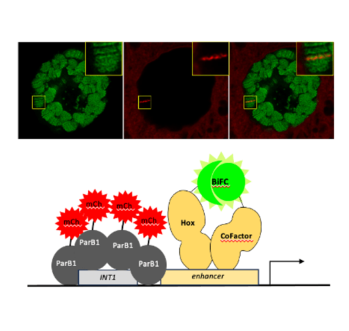 Wizualizacja kompleksów białkowych na specyficznych wzmacniaczach w jądrach larwalnych Drosophila