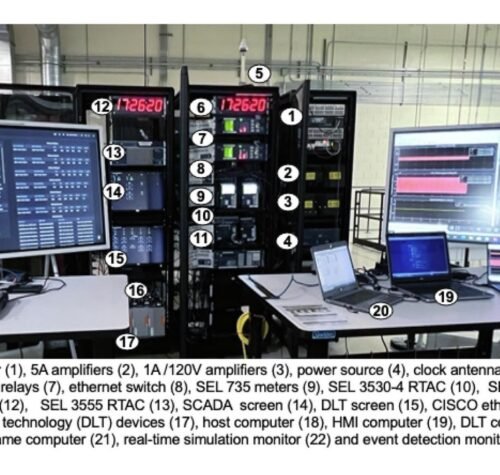 Ryc. 1: Elektryczne złoża testowe siatki podstacji jest chronione za pomocą systemu osłony sieci cybernetycznej w Advanced Protection Laboratory w Oak Ridge National Laboratory. Pokazane są: (1) symulator.
